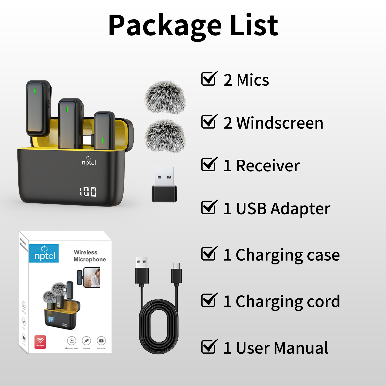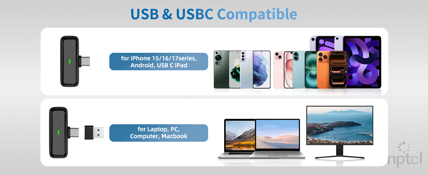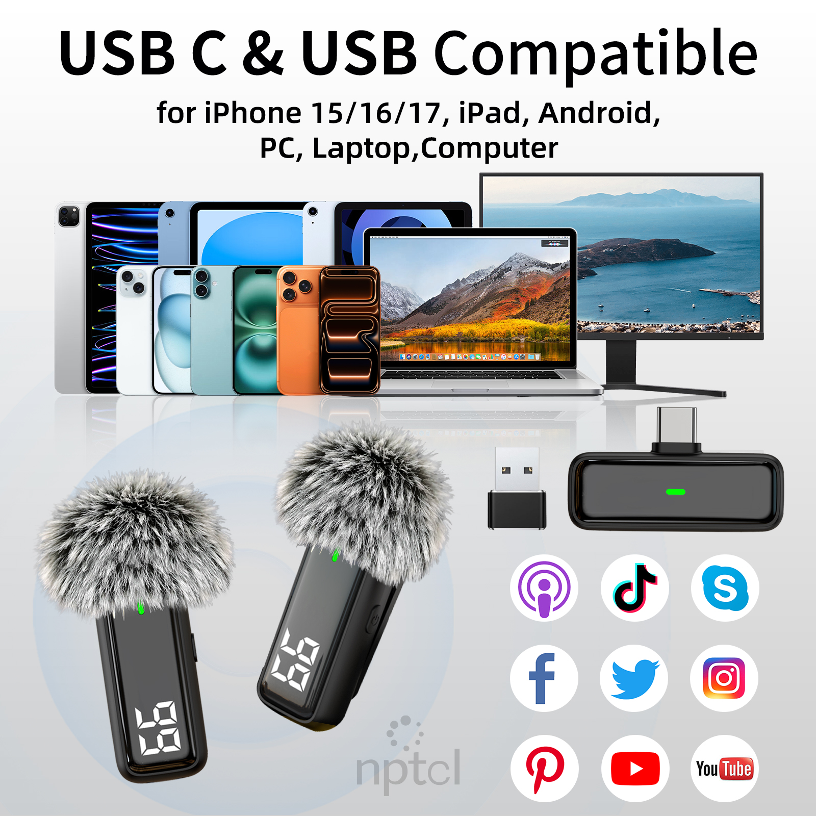 • Compatible with USB & USB C Devices and iPhone: Our upgraded dual wireless lavalier microphones are compatible with Android Phones, iPhone 15/16, iPad(USB-C), Type c iPhone, Macbook and more. With USB adapter, you can use the mic with laptop, computer, Pc. You can hold the mini lav mic by hand or clip the lapel mic to your shirt. The NPTCL wireless lavalier mics are suitale for video recording, podcasting, vlogging, tiktok, youtube, instagram, facebook and more. Upgrade your recording experience with the NPTCL Wireless Android Lapel Microphone today!