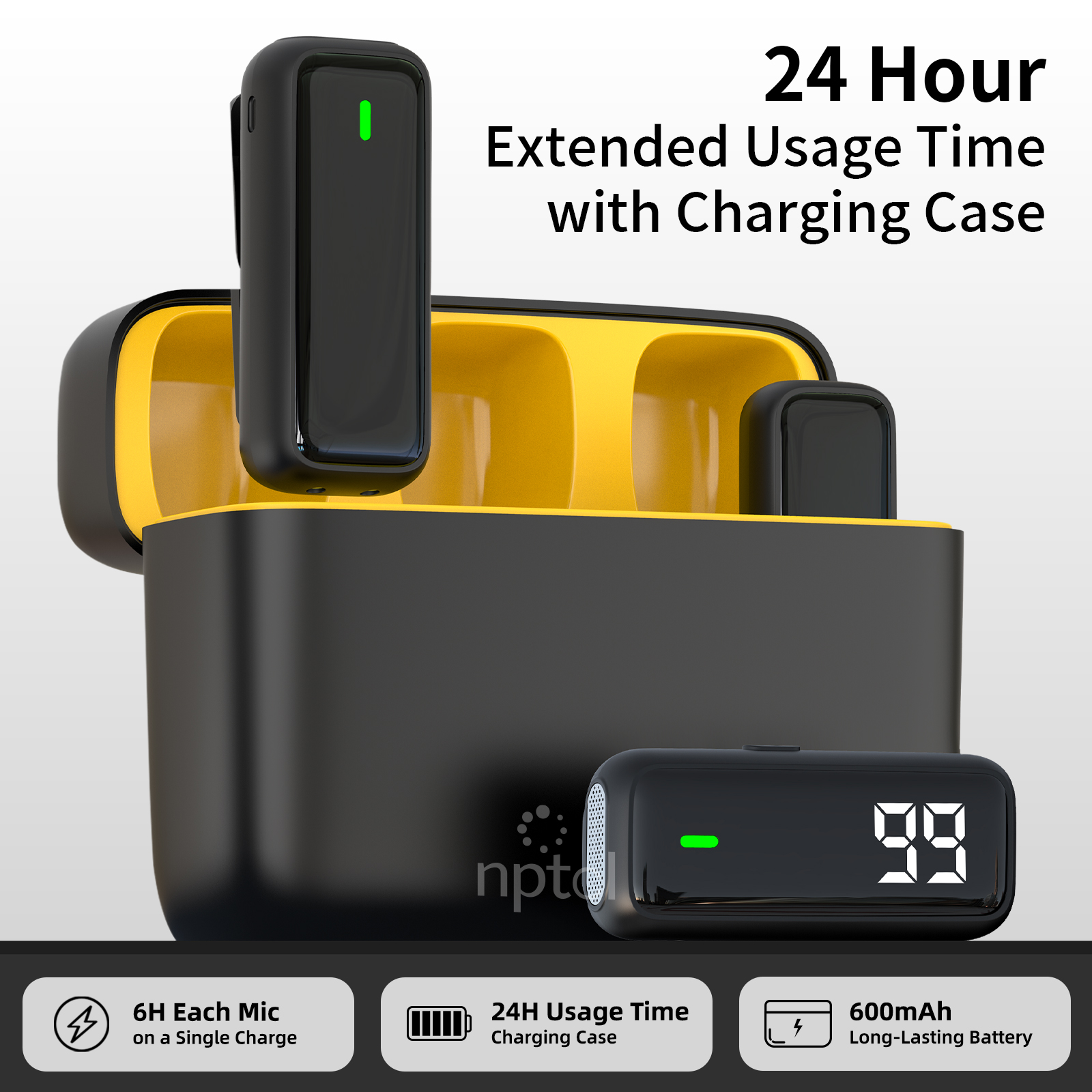 • Long-lasting Charging Case: The usb type c lapel mics work up to 24 hour with rechargeable charging case, last for 6 hours per microphone on a full charge. The number on the lav mics and chargeing case tell you how much battery they have left